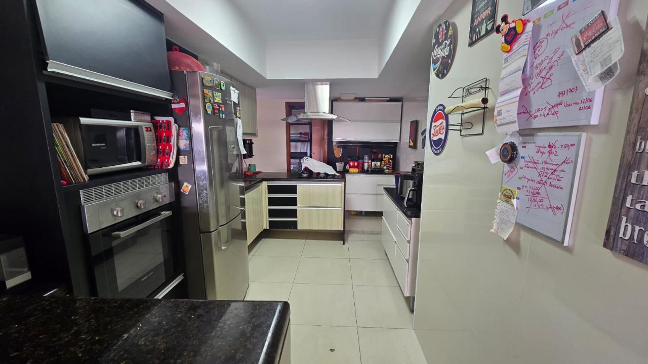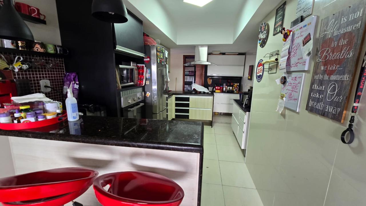 Cozinha americana com armários planejados, pia de mármore e bancada